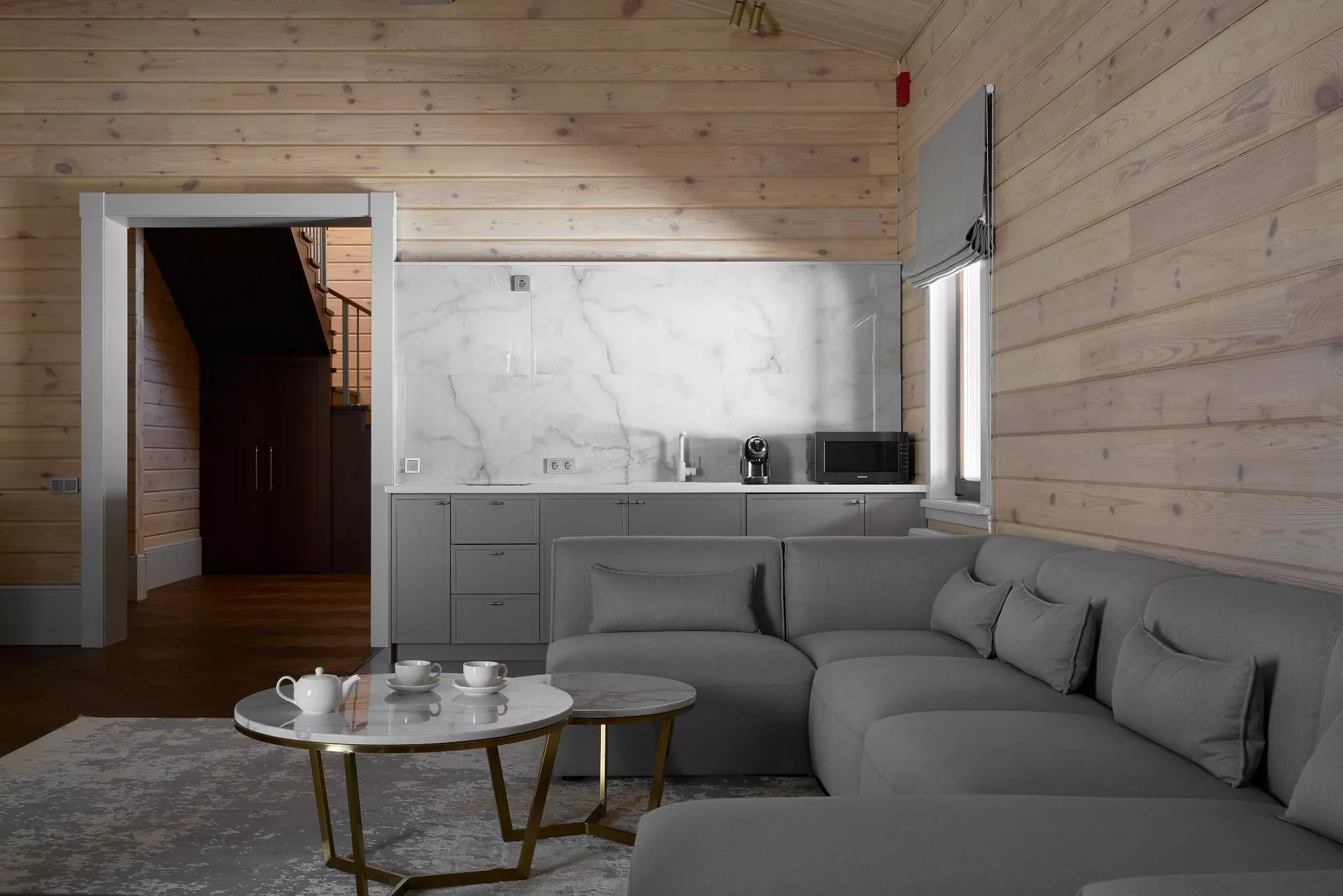 - общая зона с камином в коттедже