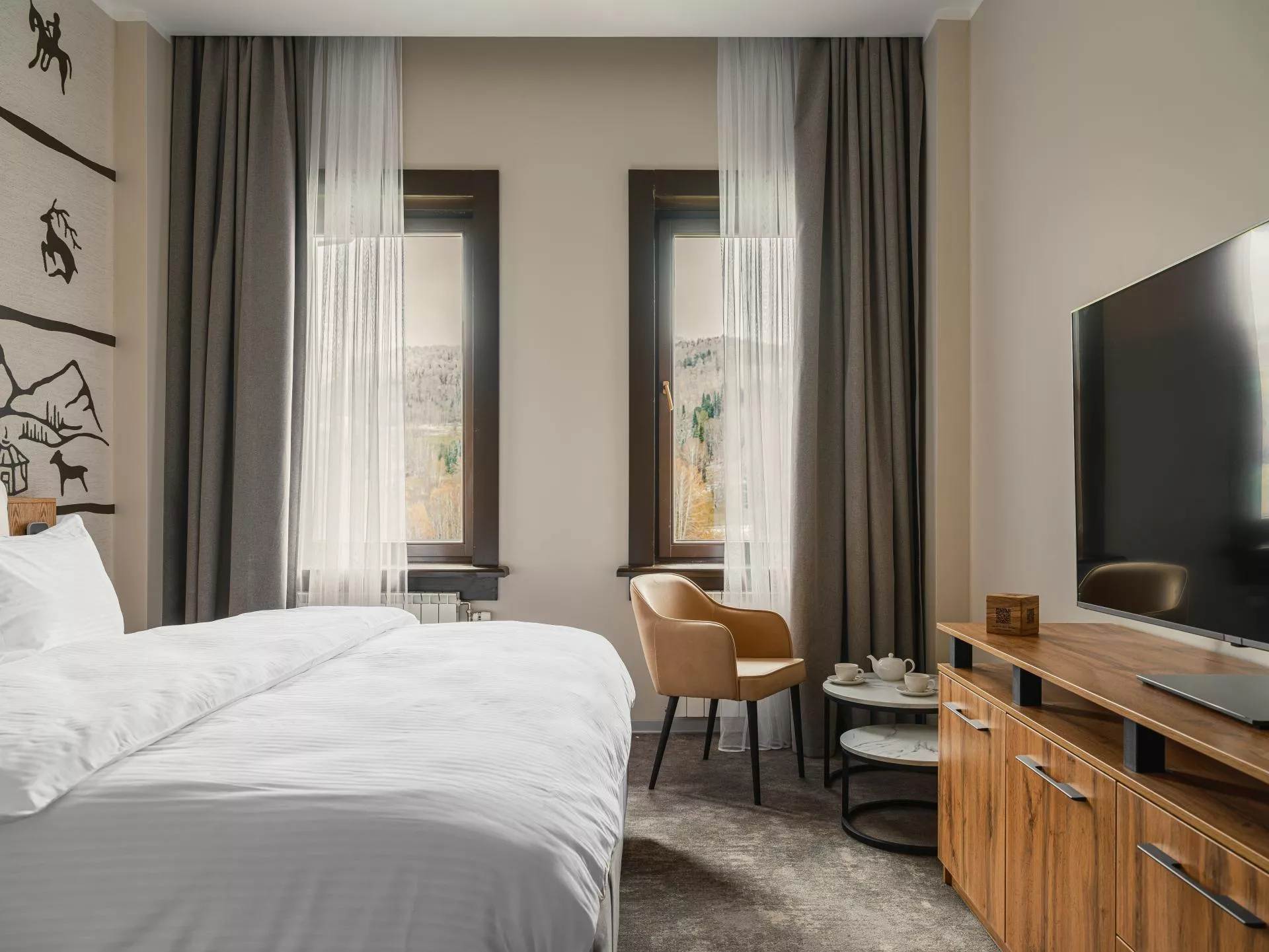 Новый дизайн с аутентичными локальными петроглифами, безупречная эргономика номера, комфорт и автоматизация! Теперь в каждом номере для вас Яндекс станция "Алиса" для регулирования освещения и не только. Все это дополнено высококлассным сервисом и незабываемыми впечатлениями.